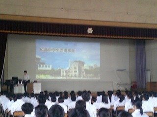 上越市の事業に参加した代表生徒から、広島派遣事業の報告がありました。上越市では毎年、各中学校から1名が派遣され、広島平和記念式典にも参加しています。スライドを使って、わかりやすく聞きやすい発表でした。きっと多くの時間を使い、資料を調べたり、構成を工夫したりしてくれたのだと思います。発表してくれた代表の生徒、そして素晴らしい態度で聴いてくれた生徒の皆さん、ありがとうございました。